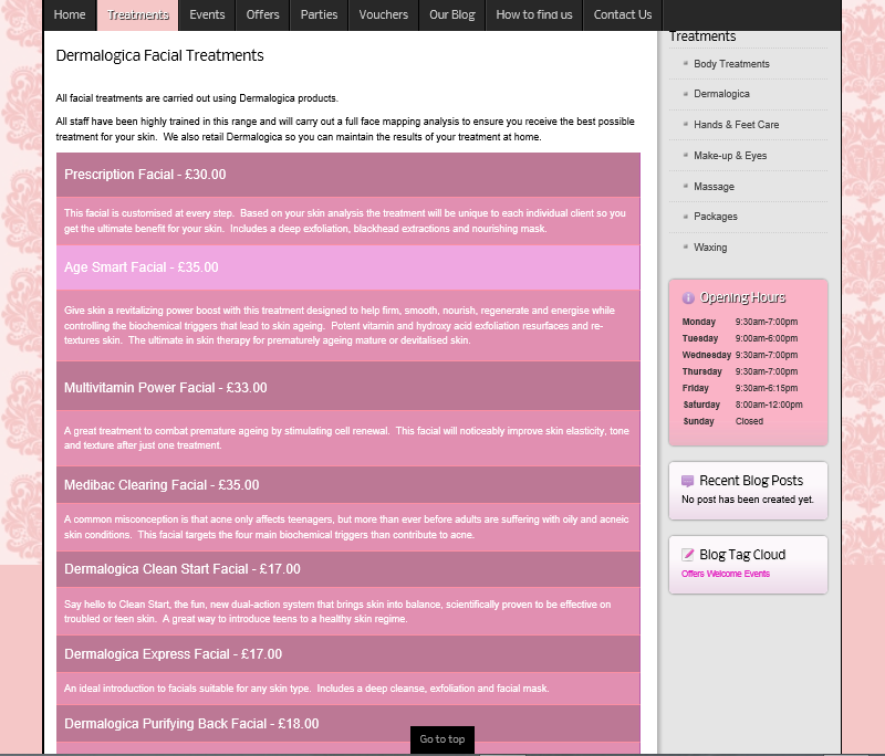 Blog categories have been setup for Offers and Events, and these are linked to the appropriate main menu link - this way, the salon can quickly and easily manage their own pages, and with the easy ability for visitors to subscribe to the blog, they'll all be updated as soon as anything is posted!