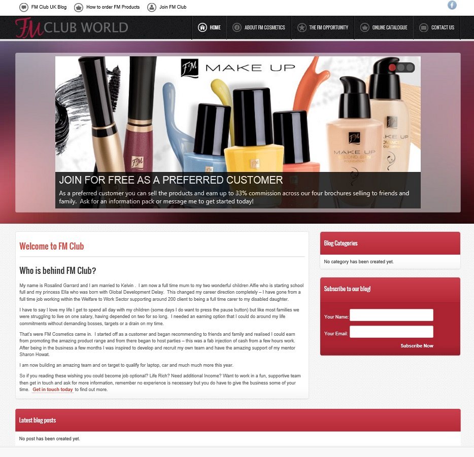 We went through a few design changes before deciding on the final website, which includes a fully integrated blog which auto-posts to Facebook and Twitter. A range of pages were created to advertise and explain the options for anyone else looking to join the FM Group scheme, with downloadable product brochures and a bespoke 'Join FM' online form was setup to make it easy for visitors to become part of the FM Club World team.