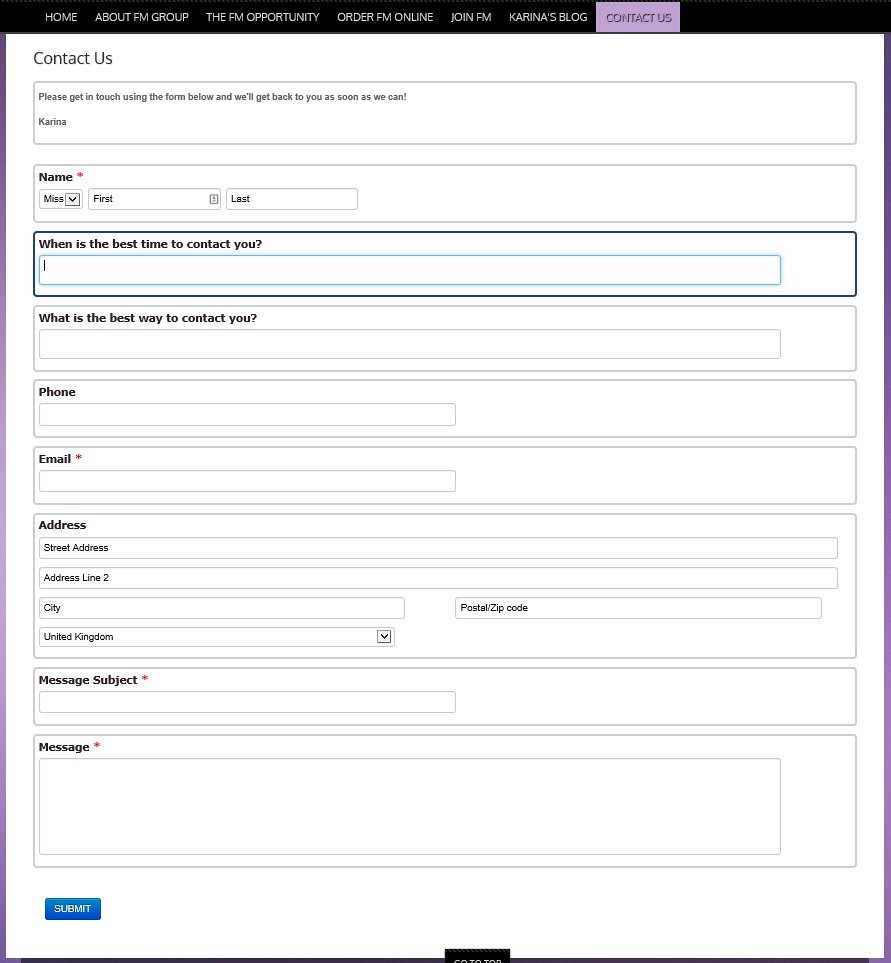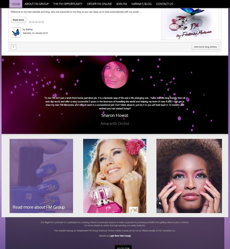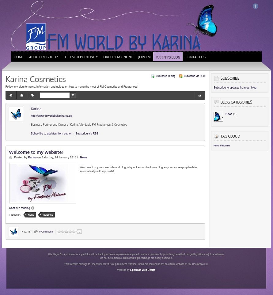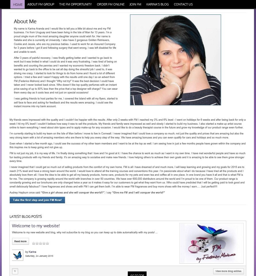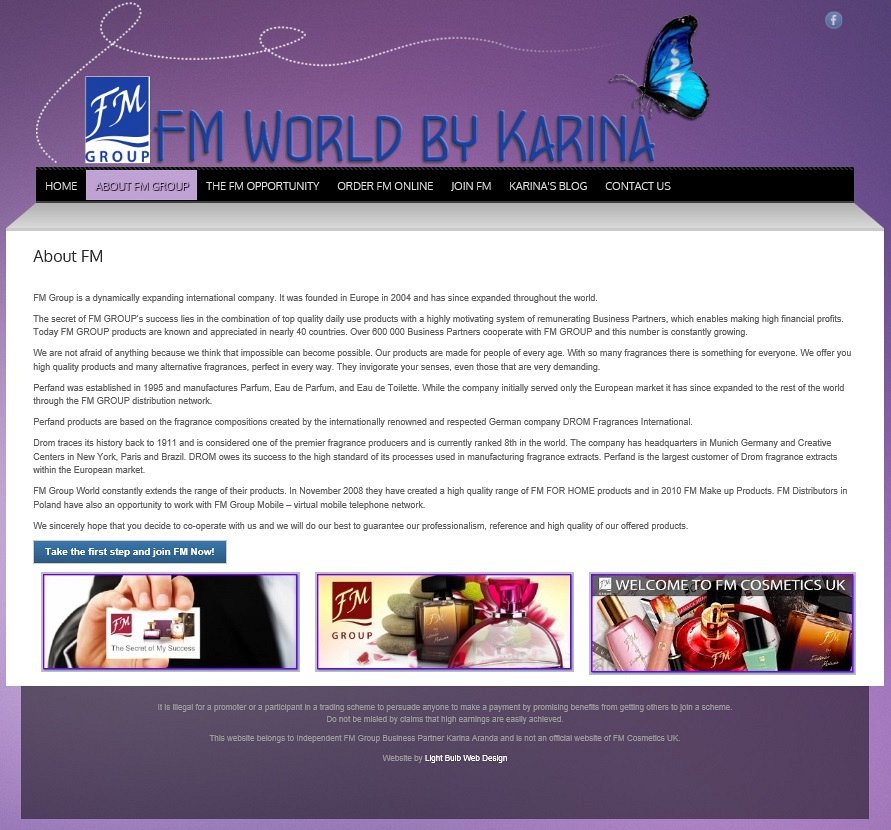 We presented a number of colour schemes and logo ideas to Karina before deciding on the final website design and logo, resulting in a professional yet colourful website which Karina was thrilled with. Alongside pages covering the FM Group and what Karina's business can offer, the website includes a bespoke online form to allow visitors to sign-up to Karina's team online. A fully integrated website blog has been setup which we have linked with Facebook, Twitter and LinkedIn, creating apps within each platform to allow all new and updated blog posts to be sent automatically to each social media platform without Karina having to update each one herself.