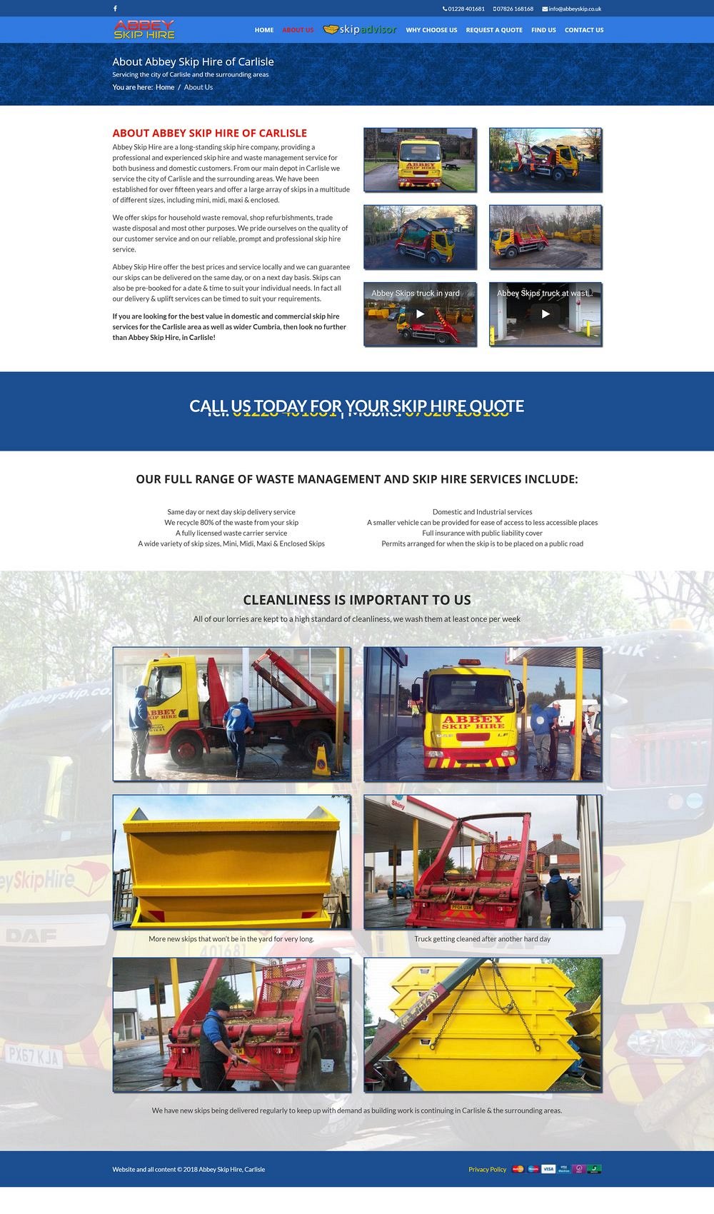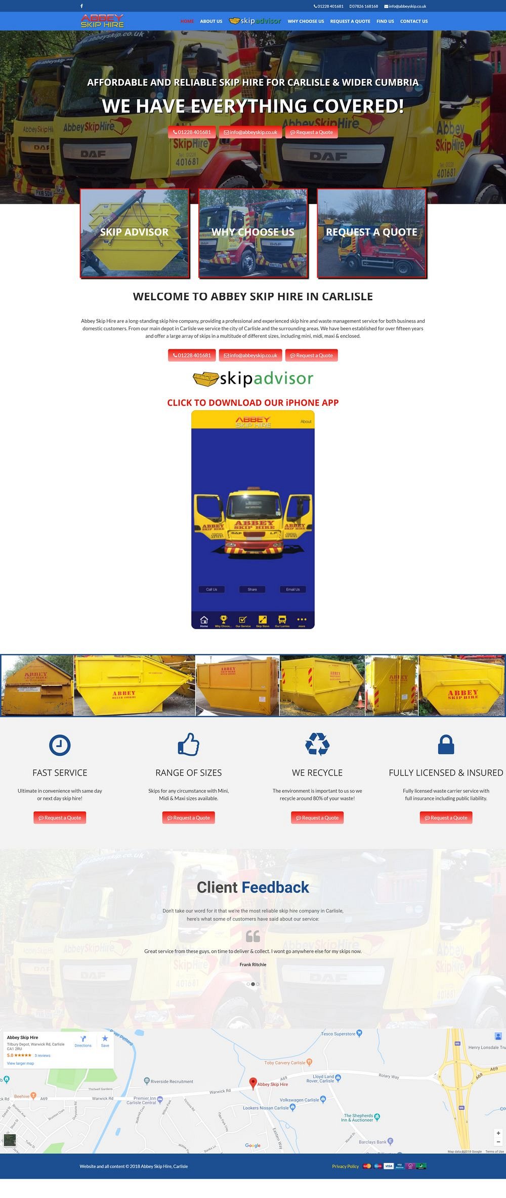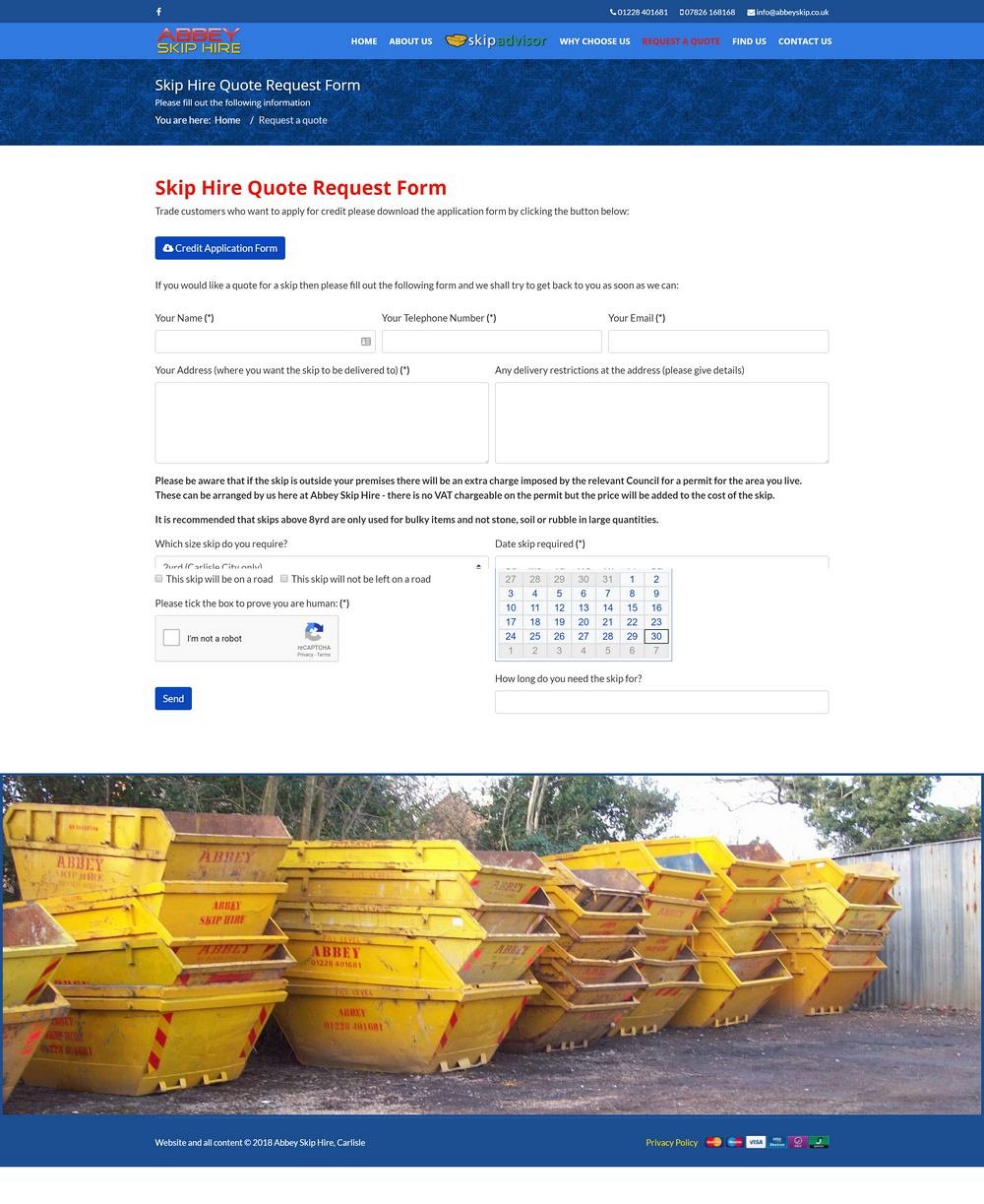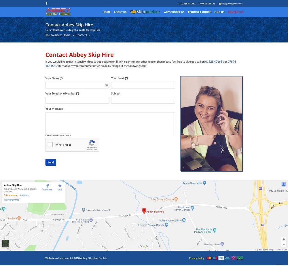 Abbey Skip Hire in Carlisle got in touch after being recommended by another local business - they were initially just wanting someone to take over the hosting and support of their exisitng website, however after some initial discussion and research, it became clear that whilst the website had great search engine results, the design and presentation had loads of room for improvement.