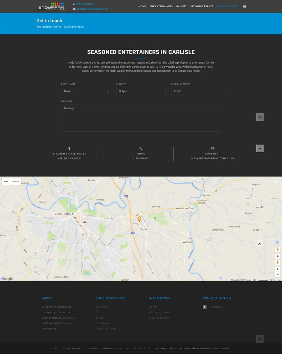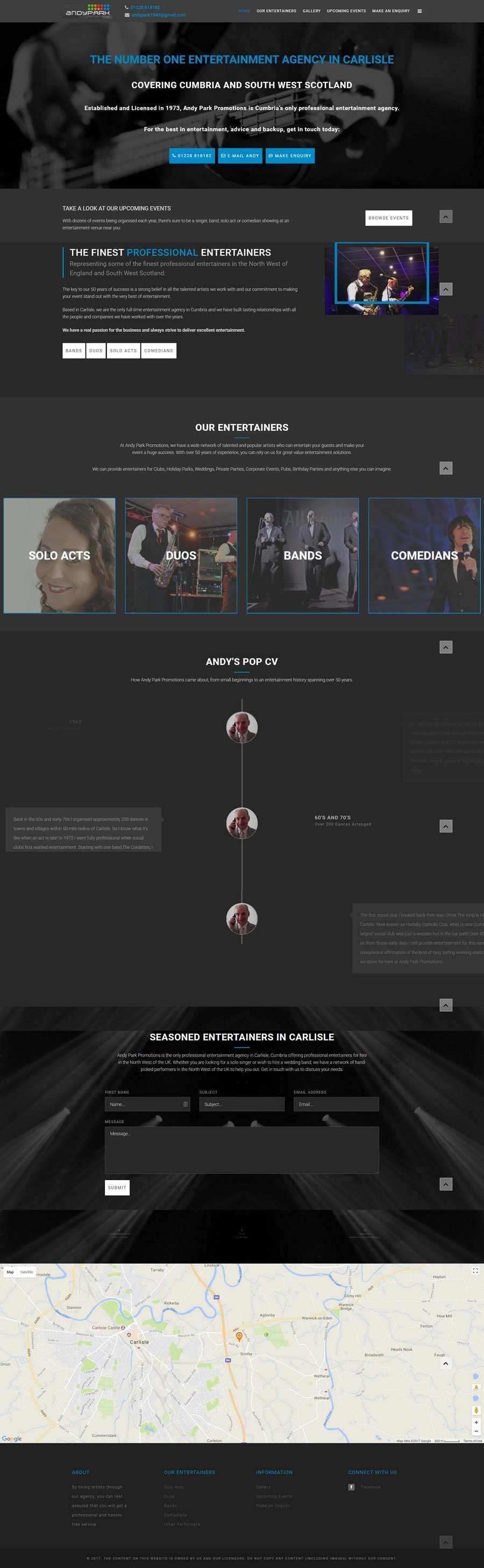 After being recommended to use by another client (Infinity Print Solutions), Andy asked us to create a new website for his entertainment agency in Carlisle, Cumbria, bringing it up to date with a mobile friendly design, and providing a more responsive approach to updates and changes to the website compared to his previous provider.