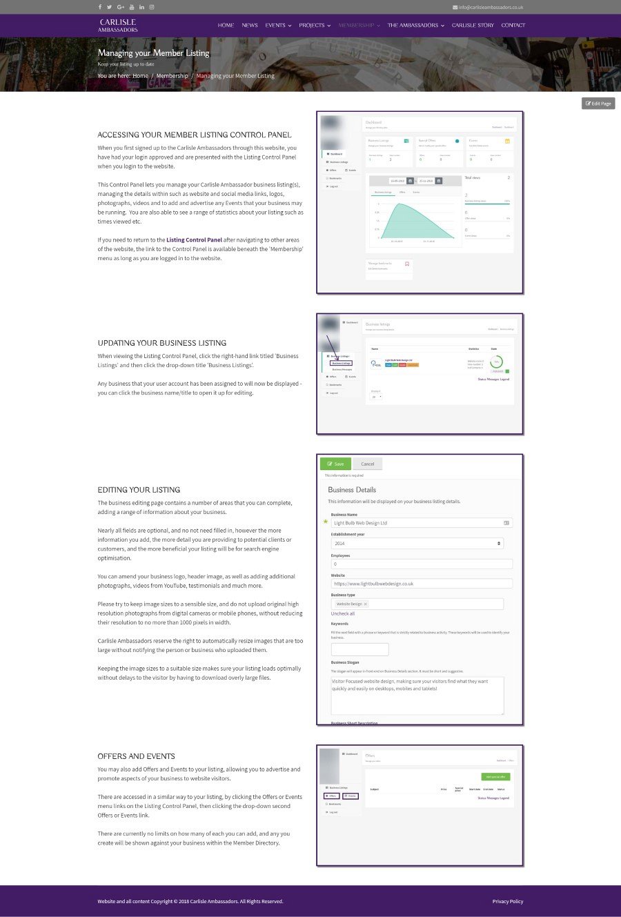 Member registration and login access was configured, requiring the website administrators to approve new user access requests, before assigning them to an existing member listing or providing access for them to set up a new one. Once logged in, users are presented with their own business listing management dashboard, and a user guide which tells them how to add and manage their listing.