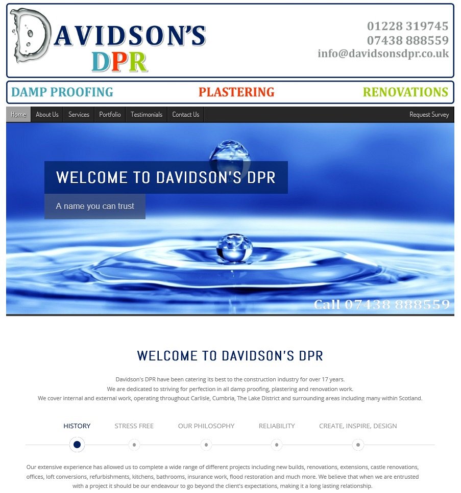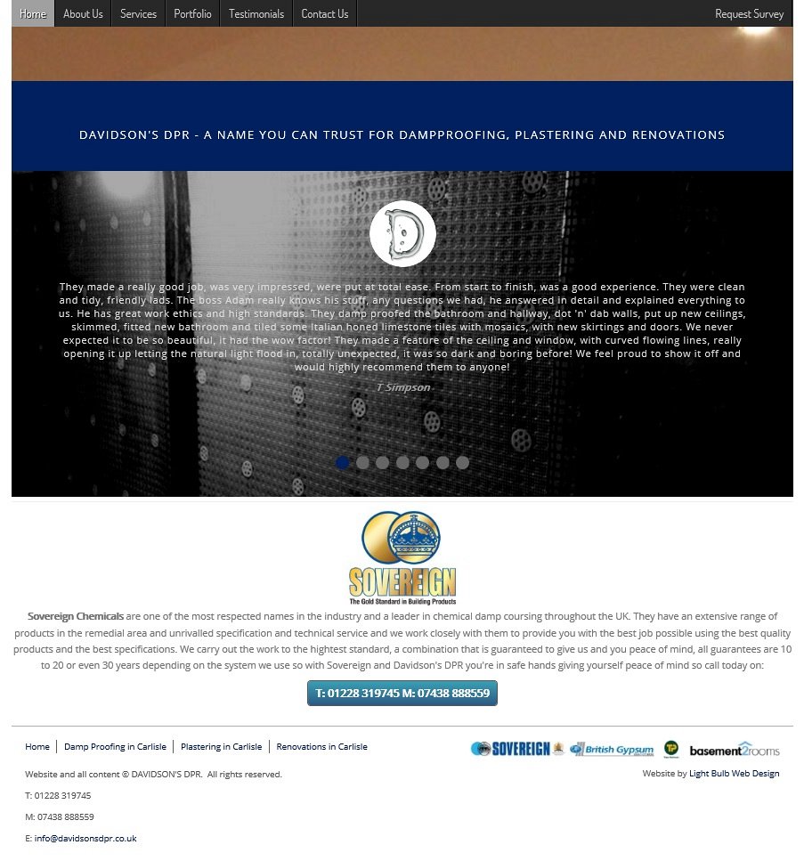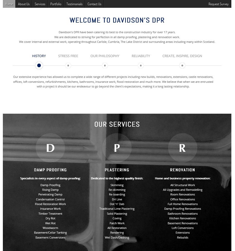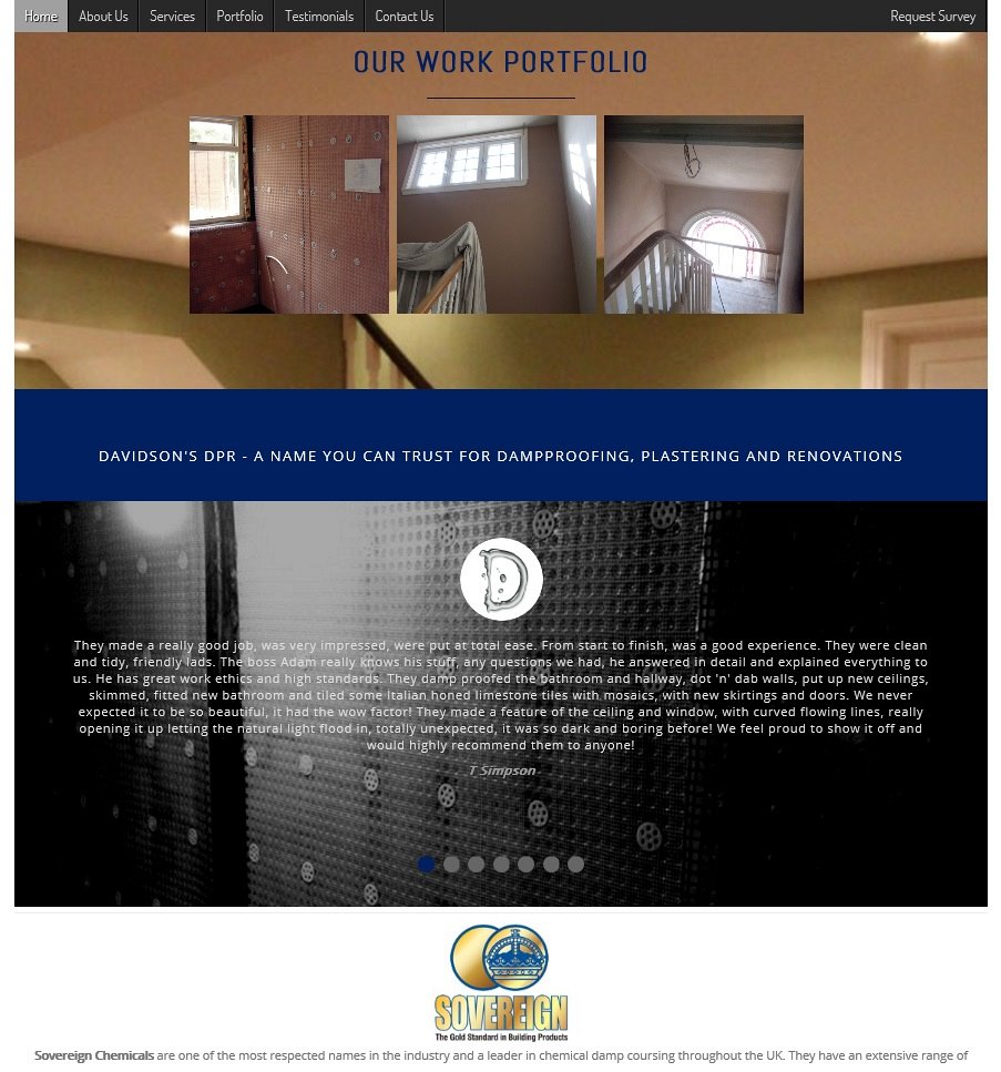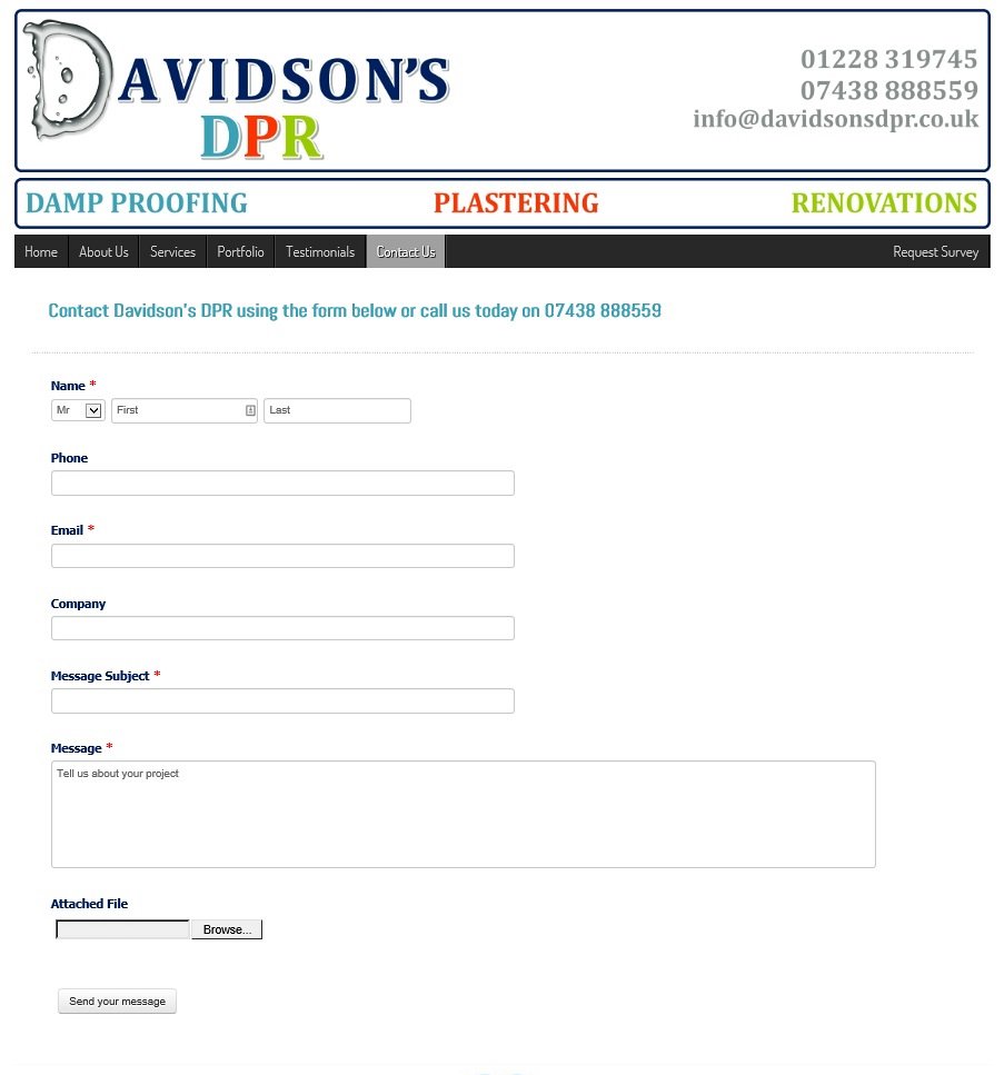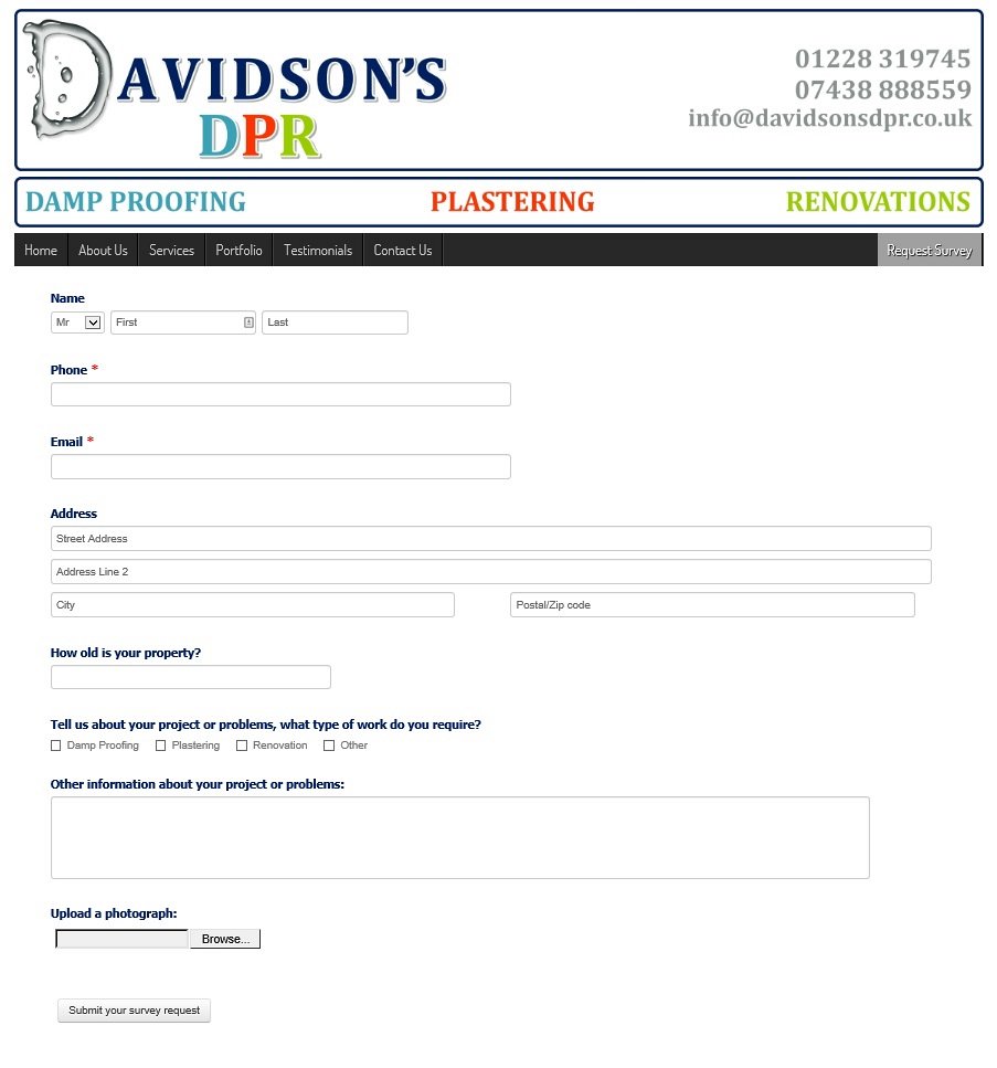The DPR colours were used in a number of hover details, menu's, links and then within each appropriate page of the website you're best to visit the website to see how these work! A bespoke 'Request Survey' form was created for website visitors to get in touch with Adam to book a survey of their project or damp proofing problem, allowing an image to be attached by the visitor if required. When submitted, the form generates an e-mail to Adam with all of the details in, including any attached photograph.