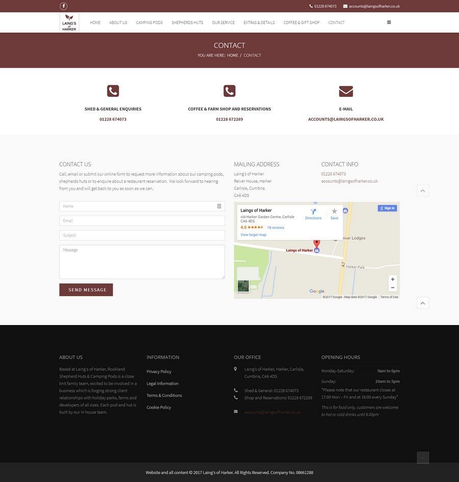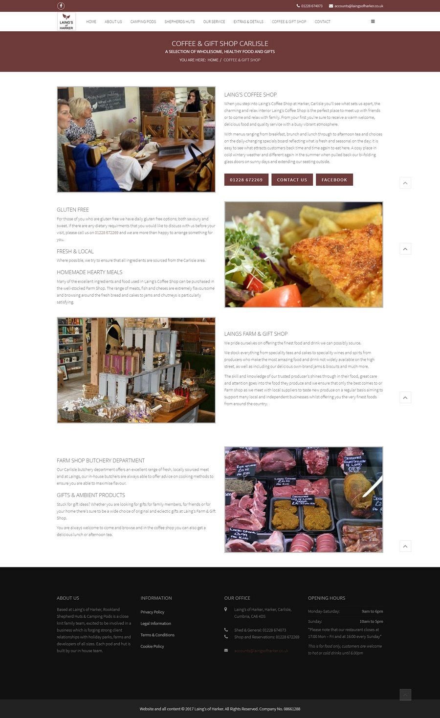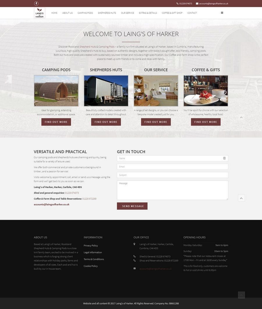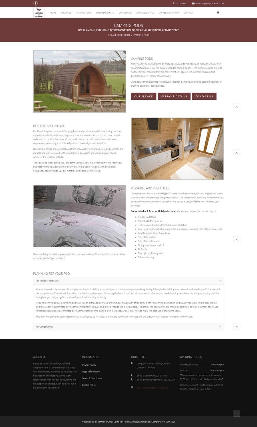 Laings had only one week before a local newspaper was publishing an article about their camping pod sales, yet their current website had little coverage of this service, so our initial work was very prompt provision of a new website design and structure, providing clear details of information linked to the newspaper article. We then added further content after the initial deadline to bring the desired focus of the website to the range of timber buildings, pods and shepherds huts that Laings of Harker provide.