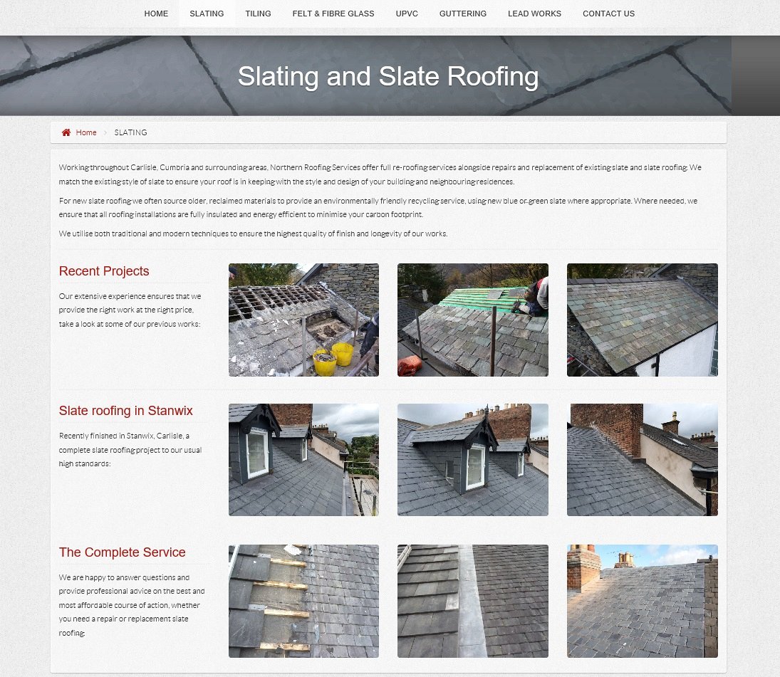 Northern Roofing Services approached a number of local companies when looking for who to work with on creating a brand new website design for their business in Carlisle. After some initial phone calls and emails to discuss ideas and prices, we were extremely pleased to be chosen, and shortly afterwards we met with them in person to go over their final requirements and costs.