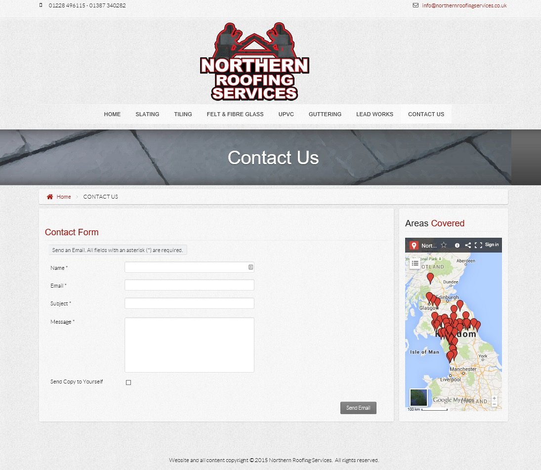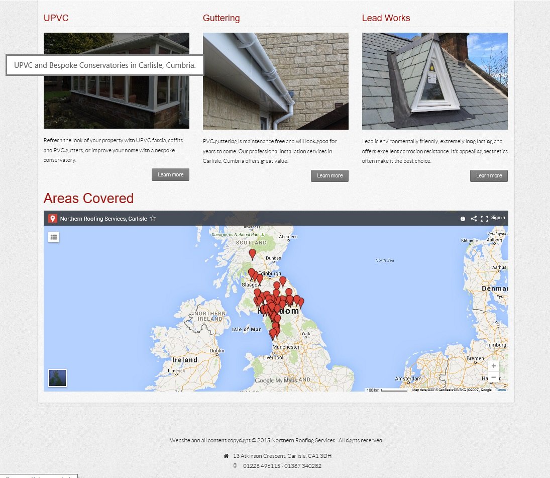 With an integrated Google Map showing the areas they cover, this final touch allows visitors to easily see what areas of the country that Northern Roofing Services can cover.