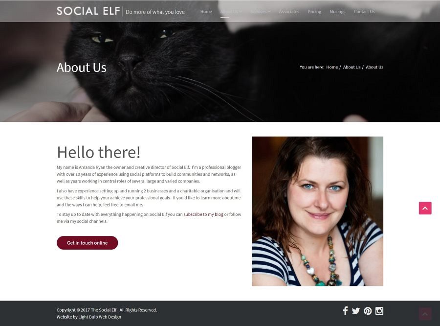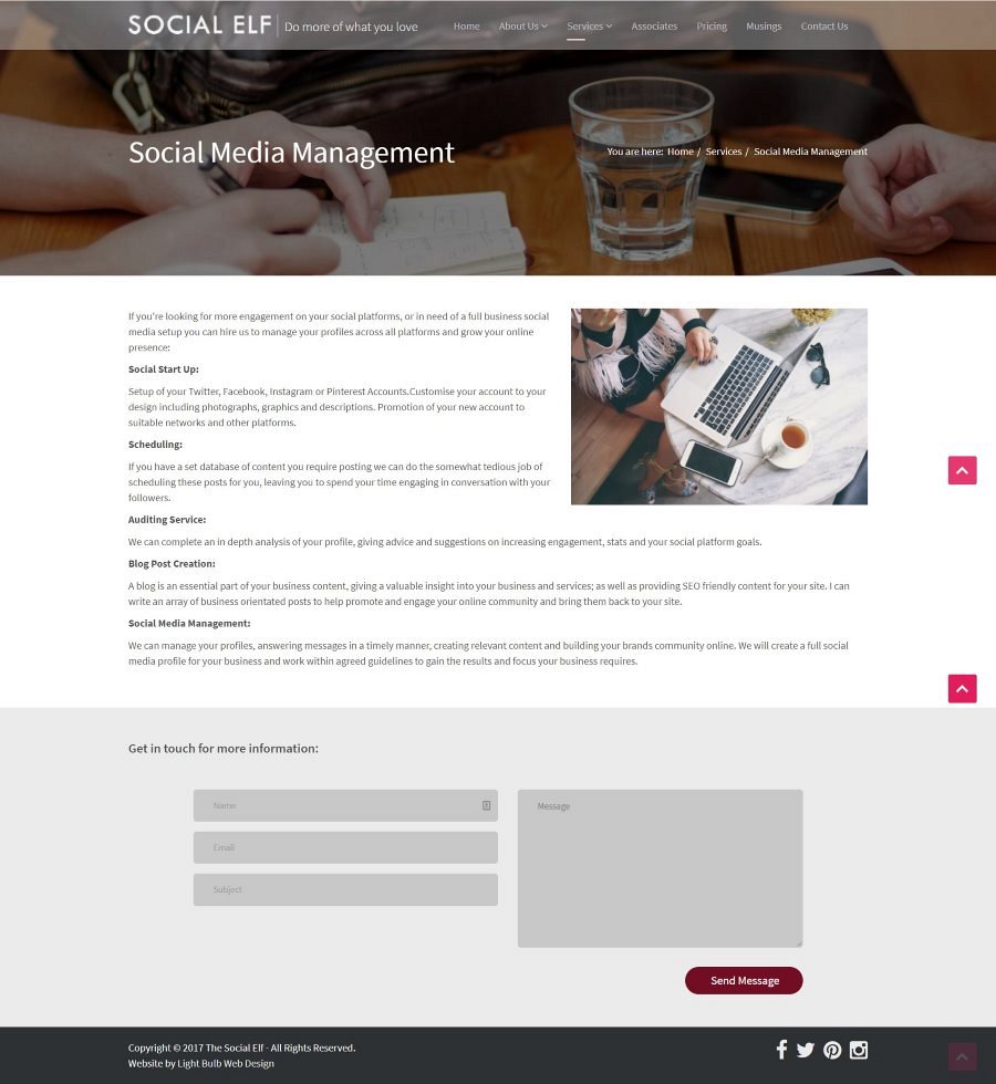 The finished website allows Amanda to login and update page content herself, and also post to the integrated blog which will be linked to Facebook and Twitter to make sure new blog posts are sent out to her website and social media channels at the same time, driving traffic back to the website which is an important factor for SEO.