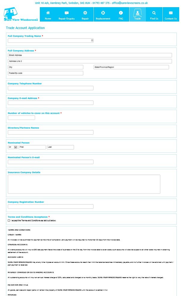 We provided a website based upon their logo, using the single colour from this to provide a fully responsive website for them, integrating a number of external website forms directly into their new website to ensure visitors didn't need to leave the Sure View Windscreens website itself. We also created a bespoke online Trade Account Application form to replace their previous downloadable word processing document version, to simplify their management of this area of their business.