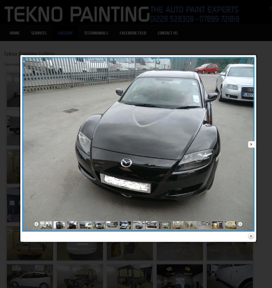 The gallery page has a straight forward grid view of example work from their portfolio, with each image popping up in larger format when each thumbnail is clicked. The colour scheme has been designed to match the body shop signage, with the theme continued onto the Contact Us form.