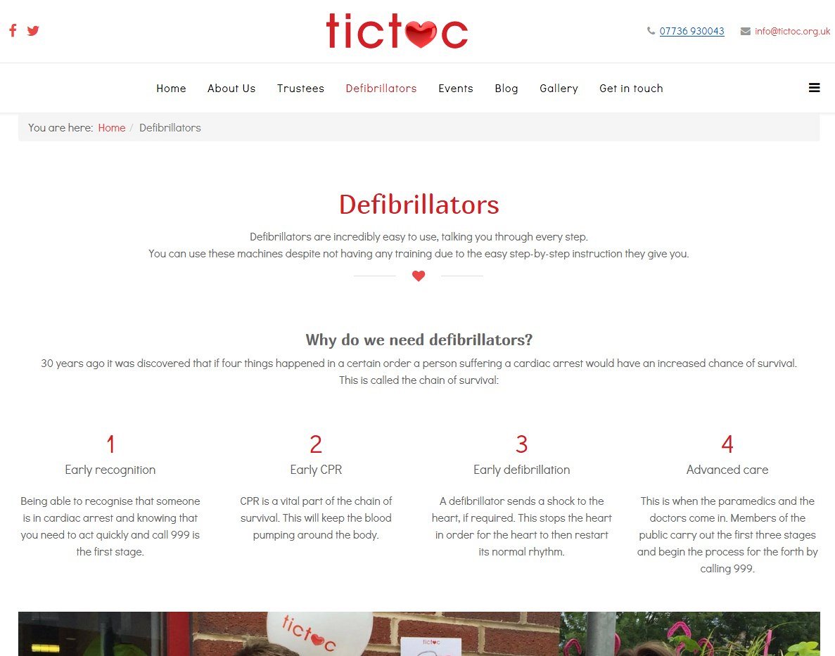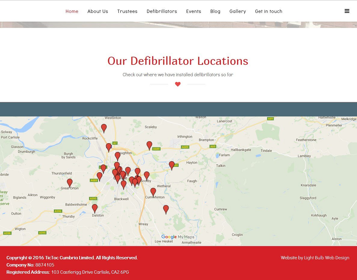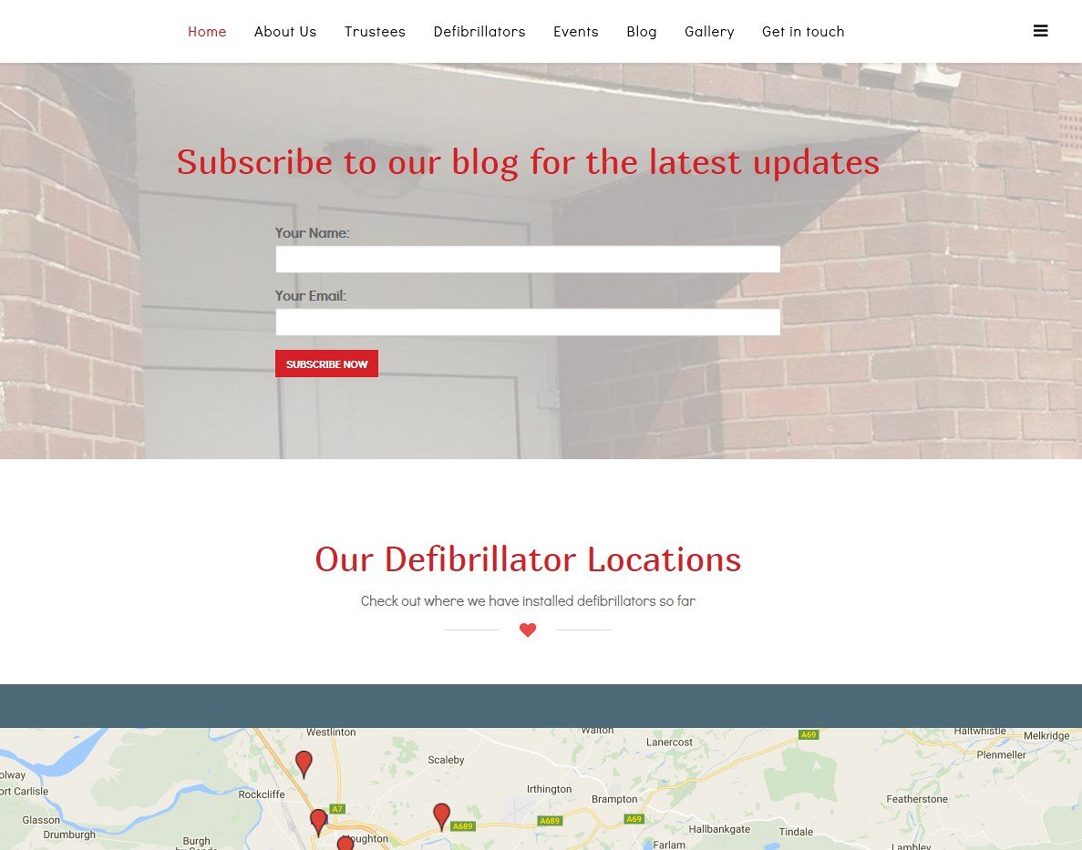 The bottom of the homepage also includes a live custom Google Map showing the locations of all the defibrillators they have helped install. This can be updated via Google and any changes will instantly reflect on the website map to new visitors.