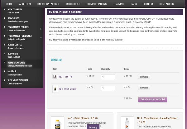 FM Cosmetics World were looking to expand their website to have a browsable product catalogue - they are not legally allowed to sell directly online so we offered a bespoke solution - website visitors can add products to a 'Wish List' and then send this list to FM Cosmetics World via the website for pricing and order information. The catalogue is designed to support easy conversion into a full e-commerce solution at a later date, to ensure that we have not wasted the clients time or money in a solution that is not future-proofed against possible changes that allow FM Cosmetics World to sell fully from their website. We provided full documentation and on-going support on use of the catalogue backend so that Sharon, the website owner, can keep the products list up to date without any complex and time consuming work. Finally, the catalogue itself is fully responsive and blends in nicely with the existing website scheme and layout after some tweaks to the original menu structure. Keeping the website easy to use for visitors is a critical feature of any website we develop!