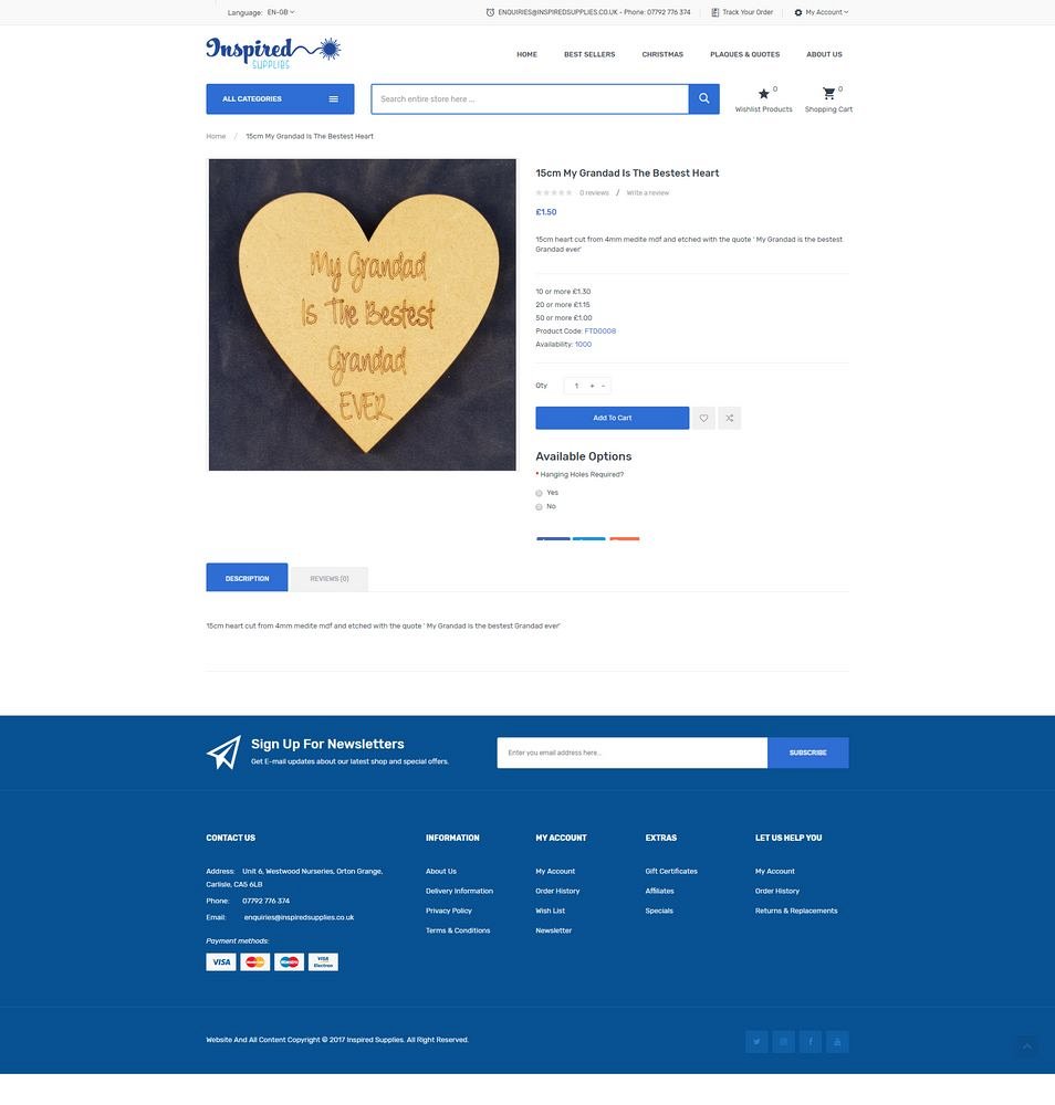 After needing to move quickly away from an existing hosting platform, Carl asked us to create a new website for his bespoke laser cut and engraving business. We were able to export all of the product and category data from the old website, manipulating this in a spreadshetet to then allow over 300 products to be quickly imported into the new platform, including automatic creation of the pre-existing category and options structure.