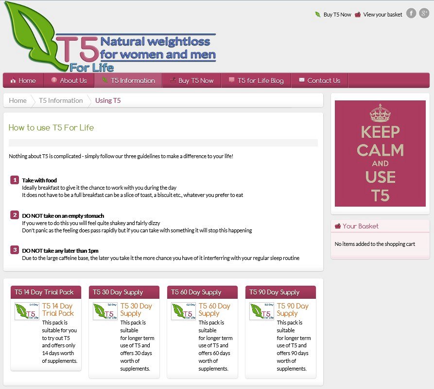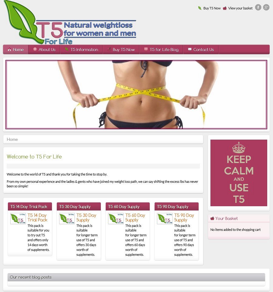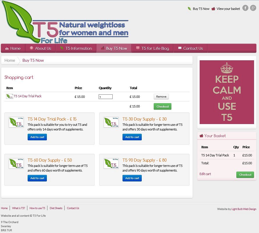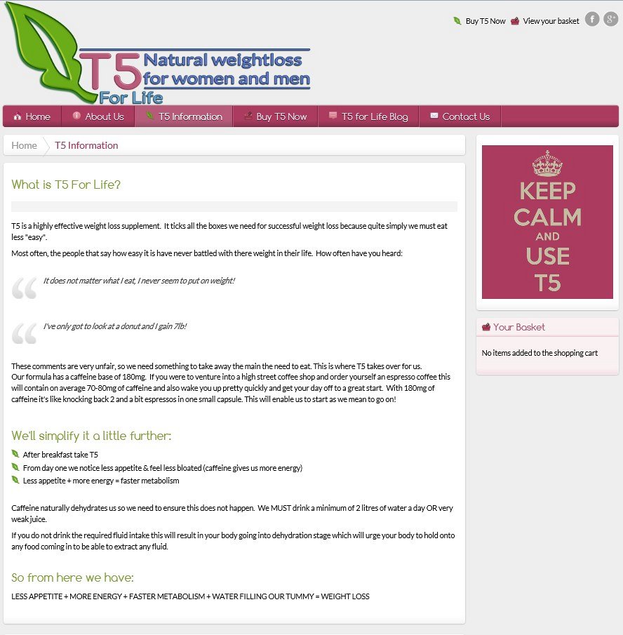 The first part of our work was to create a logo for the T5 weightloss products to be sold on the website. As T5 is a natural, caffeine-based product, we used a coffee leaf design as the base combined with the the idea of a 'slimmer waist' to indicate both the ingredients and the potential outcomes for the buyers.