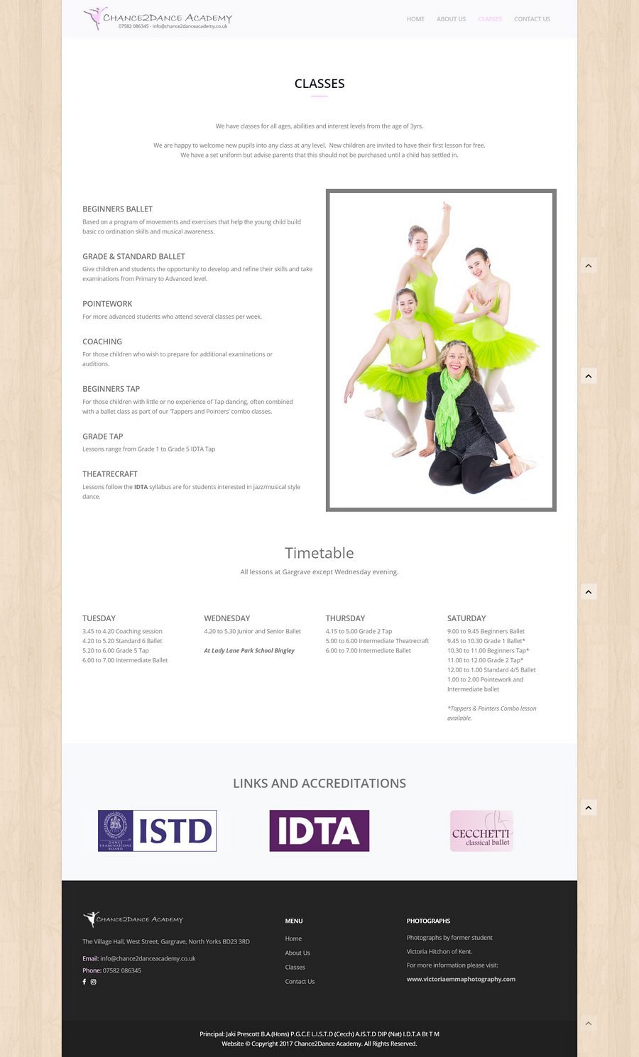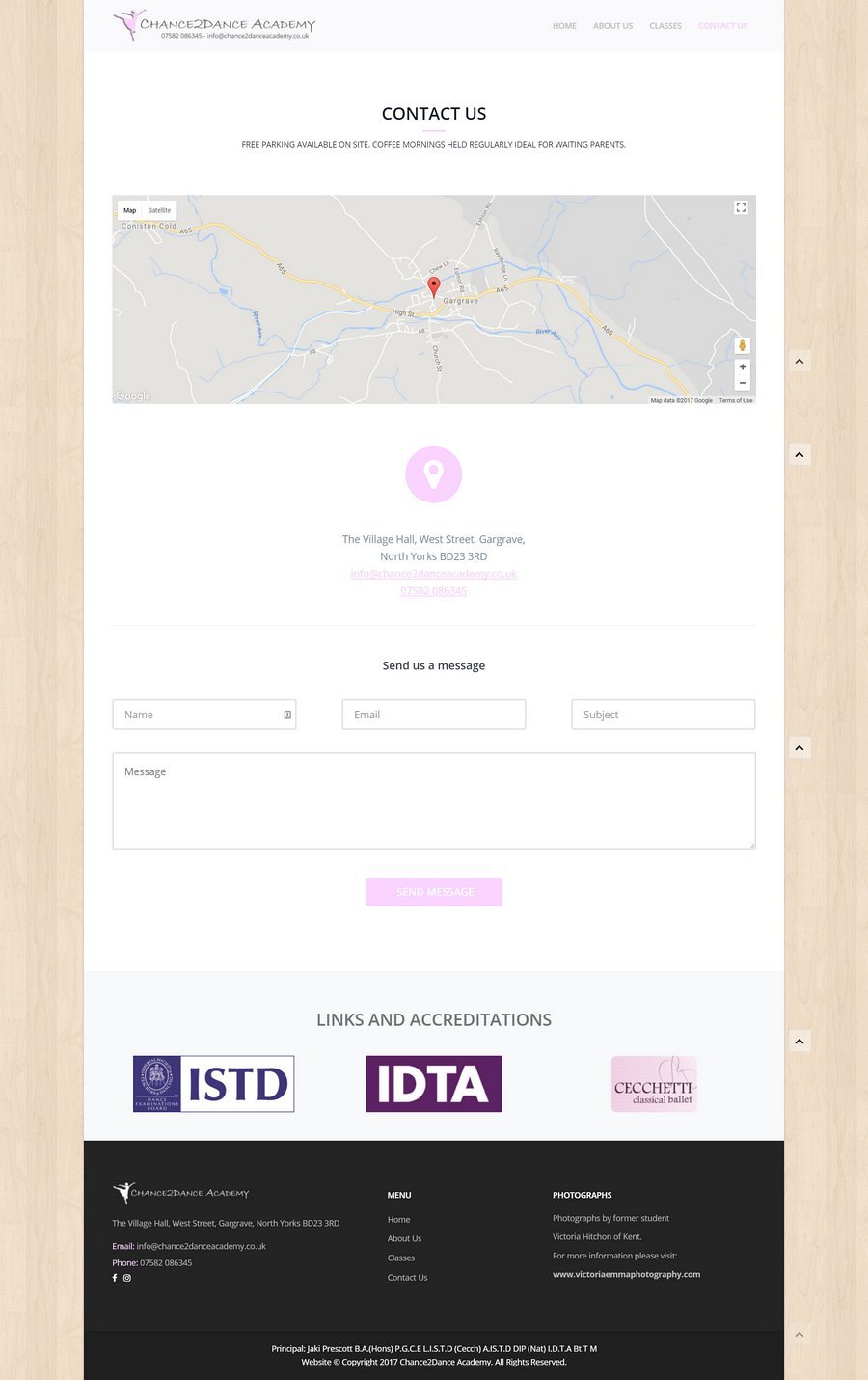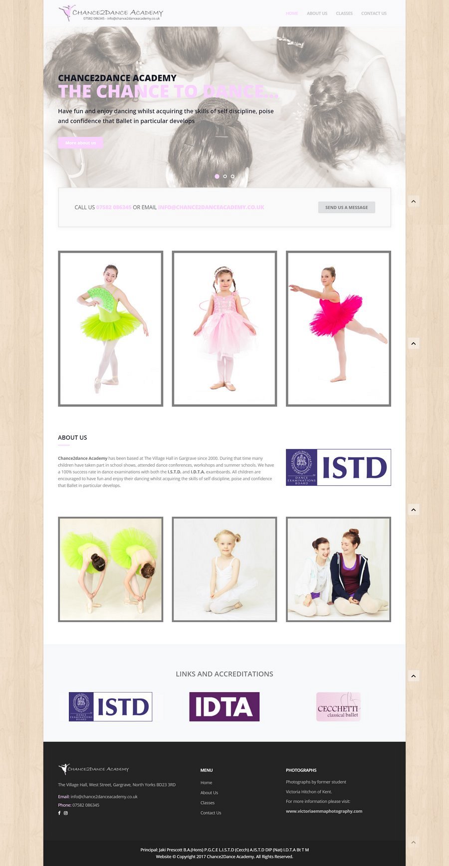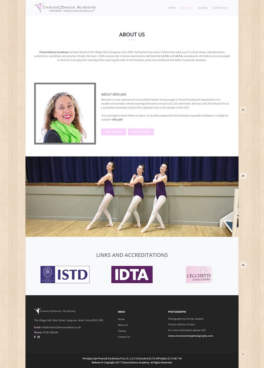 With some beautiful photographs to work with, professionally taken by www.victoriaemmaphotography.com, we added some subtle cues to their dance school, with the lightened flooring effect background as a fixed theme throughout all pages.
