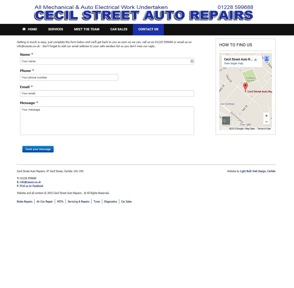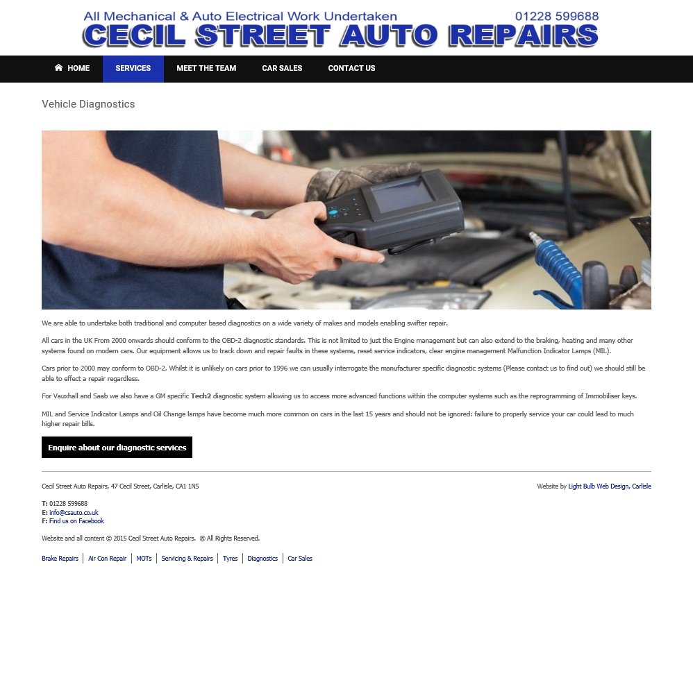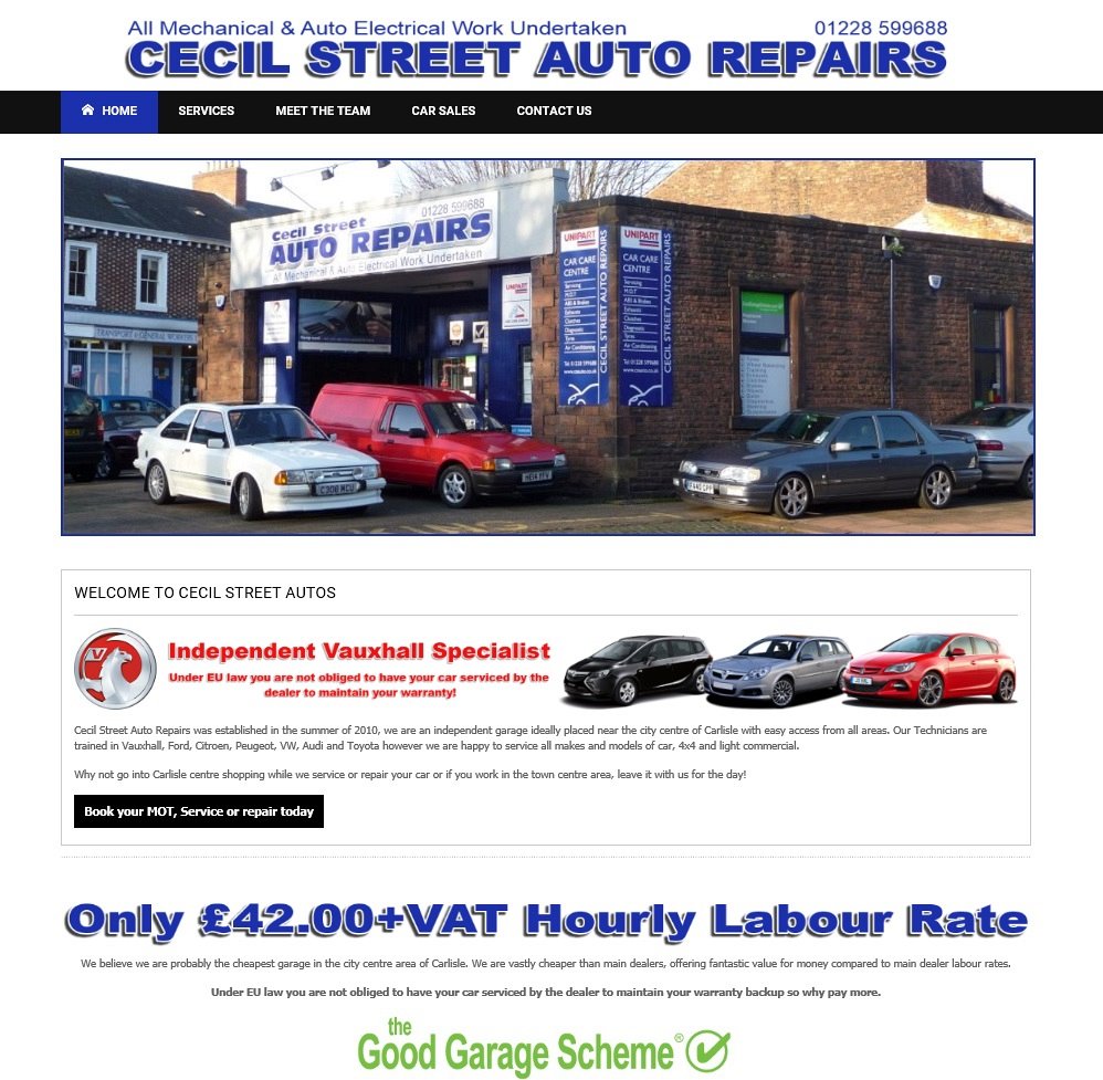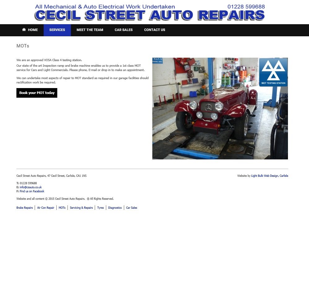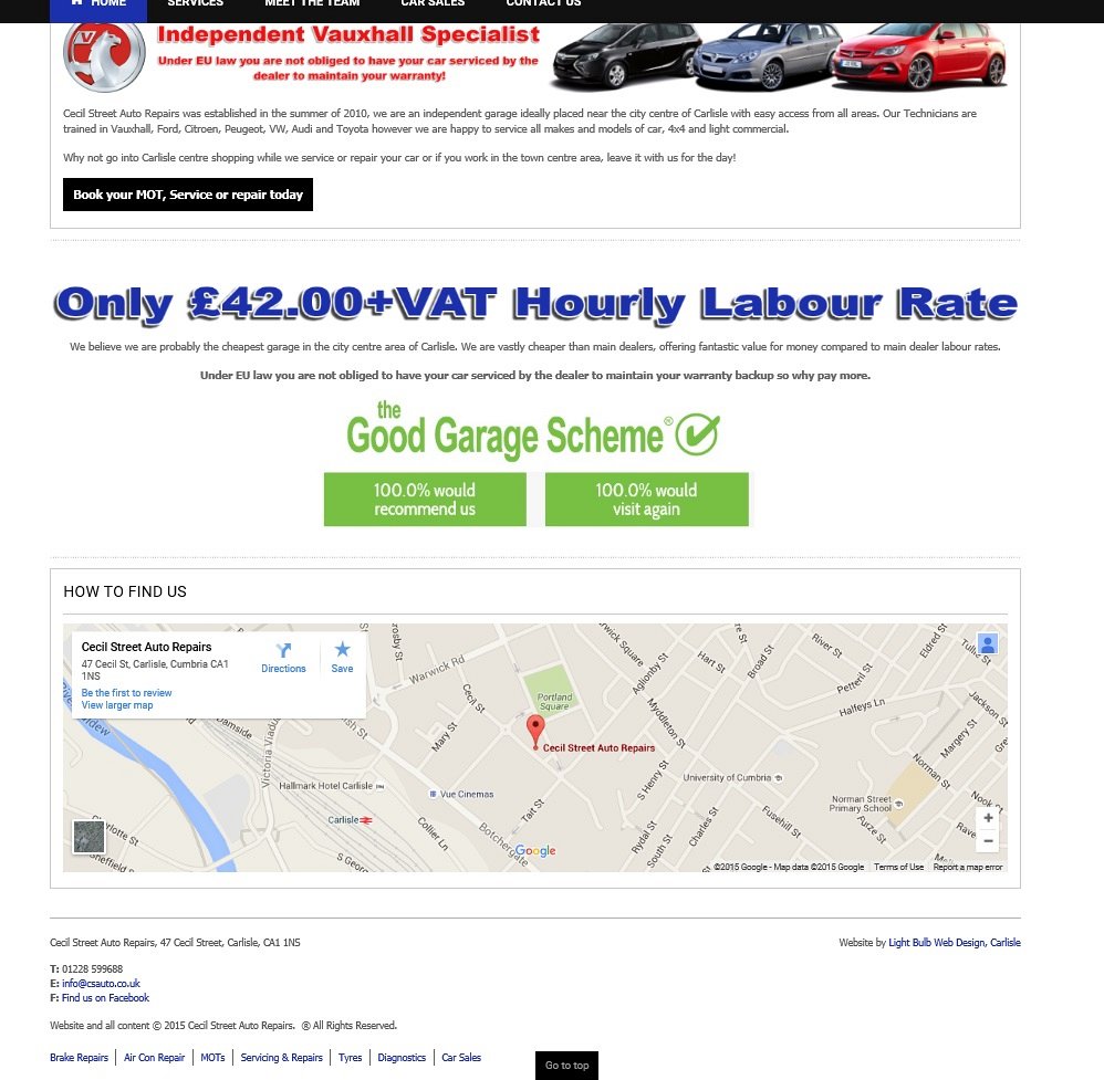 To achieve their goals, we made sure the front page of the site instantly showed a photo of their garage so people know what their business looks like and where they are. The main imagery focuses around Cecil Street Autos being an independent Vauxhall specialist, and highlighting their value for money labour rates and links to the Good Garage Scheme which they are proud to get 5 out of 5 stars for from all customer reviews! The main menu links quickly to the services they can offer.
